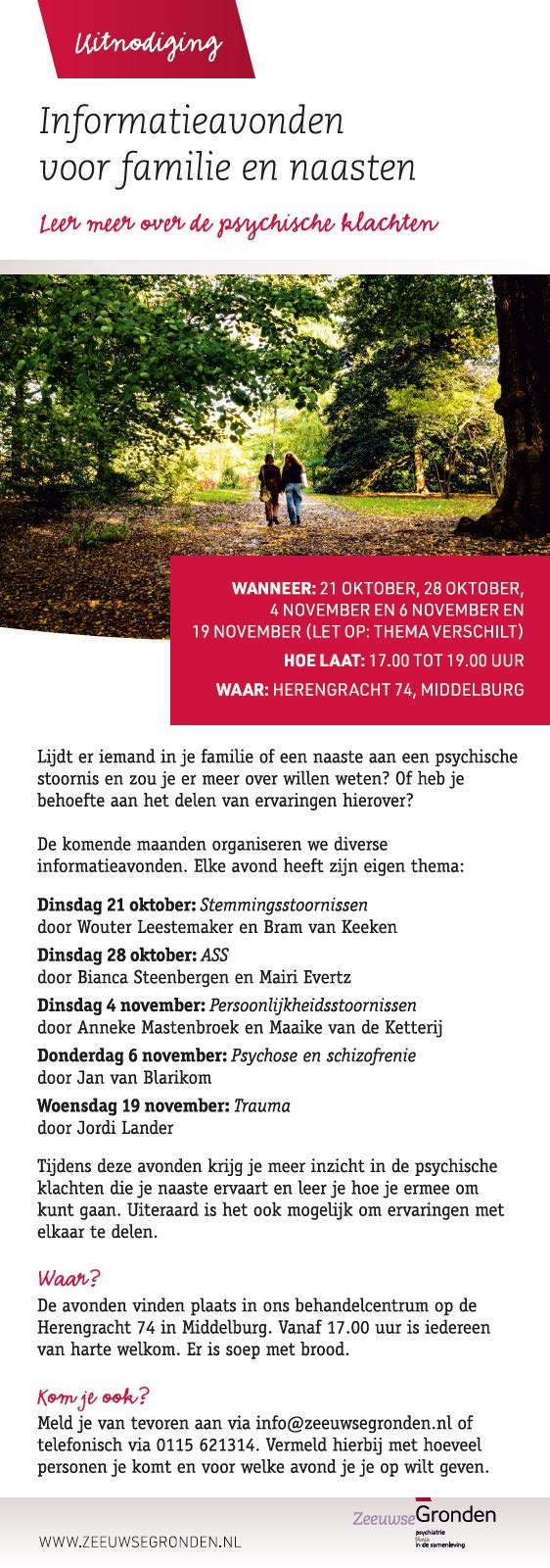 De avonden vinden plaats in ons behandelcentrum op de Herengracht 74 in Middelburg. Vanaf 17.00 uur is iedereen van harte welkom. Er is soep met brood.